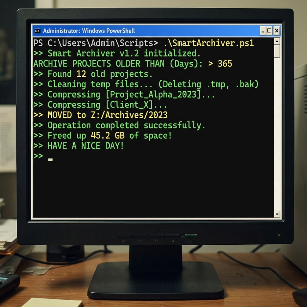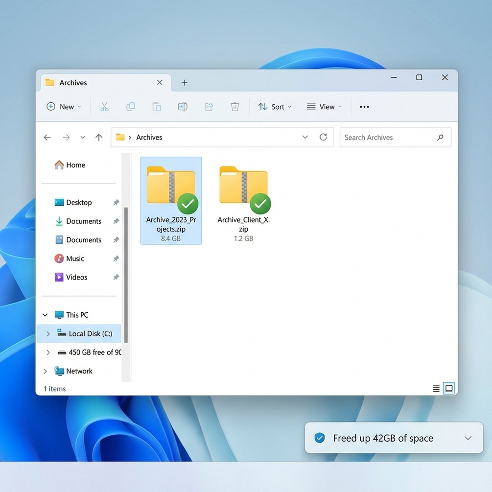 The Smart Archiver is a high-efficiency utility designed to deep-clean and compress completed projects. It identifies temporary "junk" files that occupy space and prepares your archives for long-term storage.